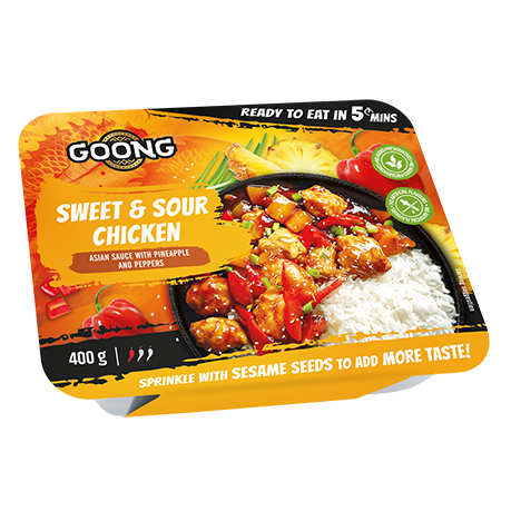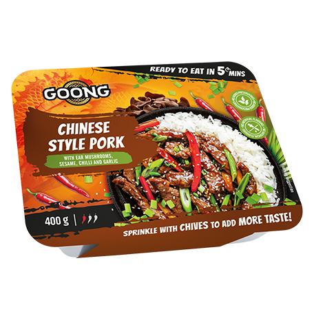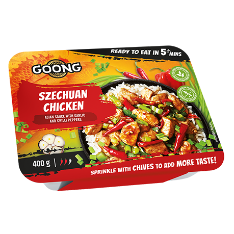 sos w stylu chińskim z grzybami 37,5 % [woda, pieczarki 25 %, cebula, sos sojowy ciemny 5,5 % (woda, sól, barwnik: karmel; cukier, odtłuszczone ziarno soi, pszenica), cukier, olej sojowy, skrobia modyfikowana, olej sezamowy, sól, warzywa suszone (seler korzeń, marchew, cebula, pietruszka korzeń, pasternak, por), aromat naturalny, olej słonecznikowy, skrobia, przyprawy, zioła, czerwona papryka chili solona 0,9 % (papryka chili, sól), ocet ryżowy, czosnek, puree z imbiru, ocet winny czerwony, grzyby mun 1,2 %, sok z cytryn, suszone płatki chili, nasiona sezamu 0,5 %];